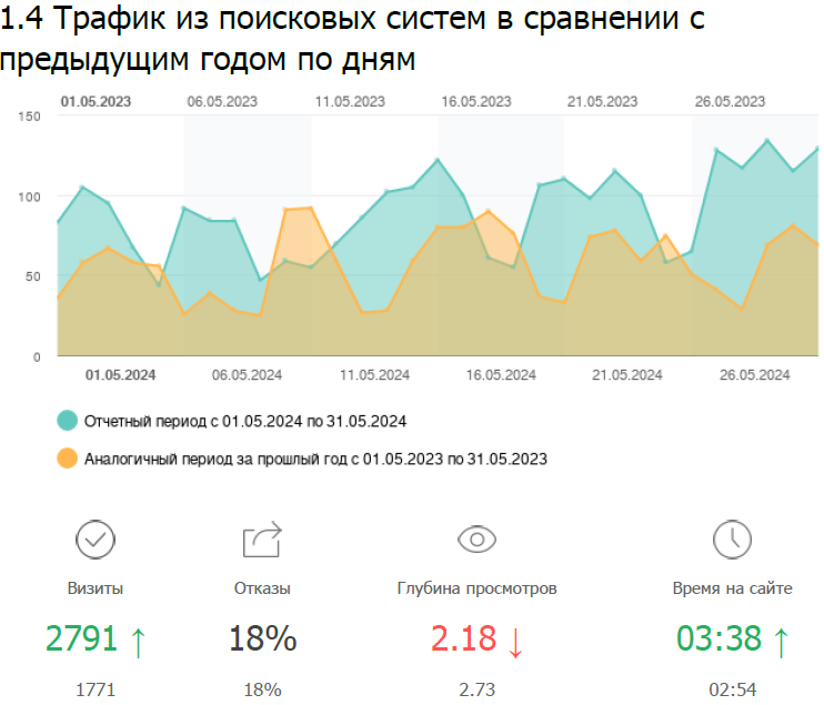 Попадание многих целевых запросов в ТОП 1-3 в обеих ПС, их стабильное удержание там, более чем полуторократный рост органического трафика.